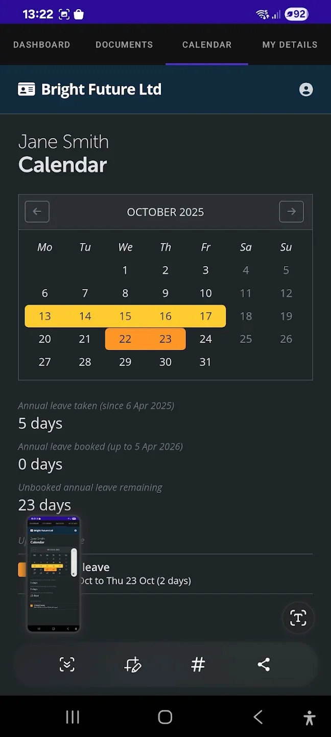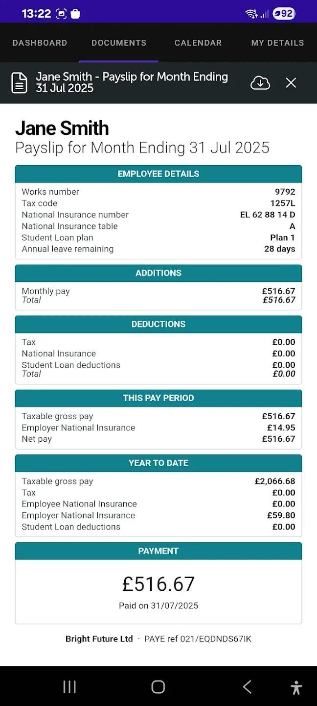 Employer Dashboard: You now have 24/7 access to payroll reports, HMRC payment schedules, and a company-wide annual leave calendar.